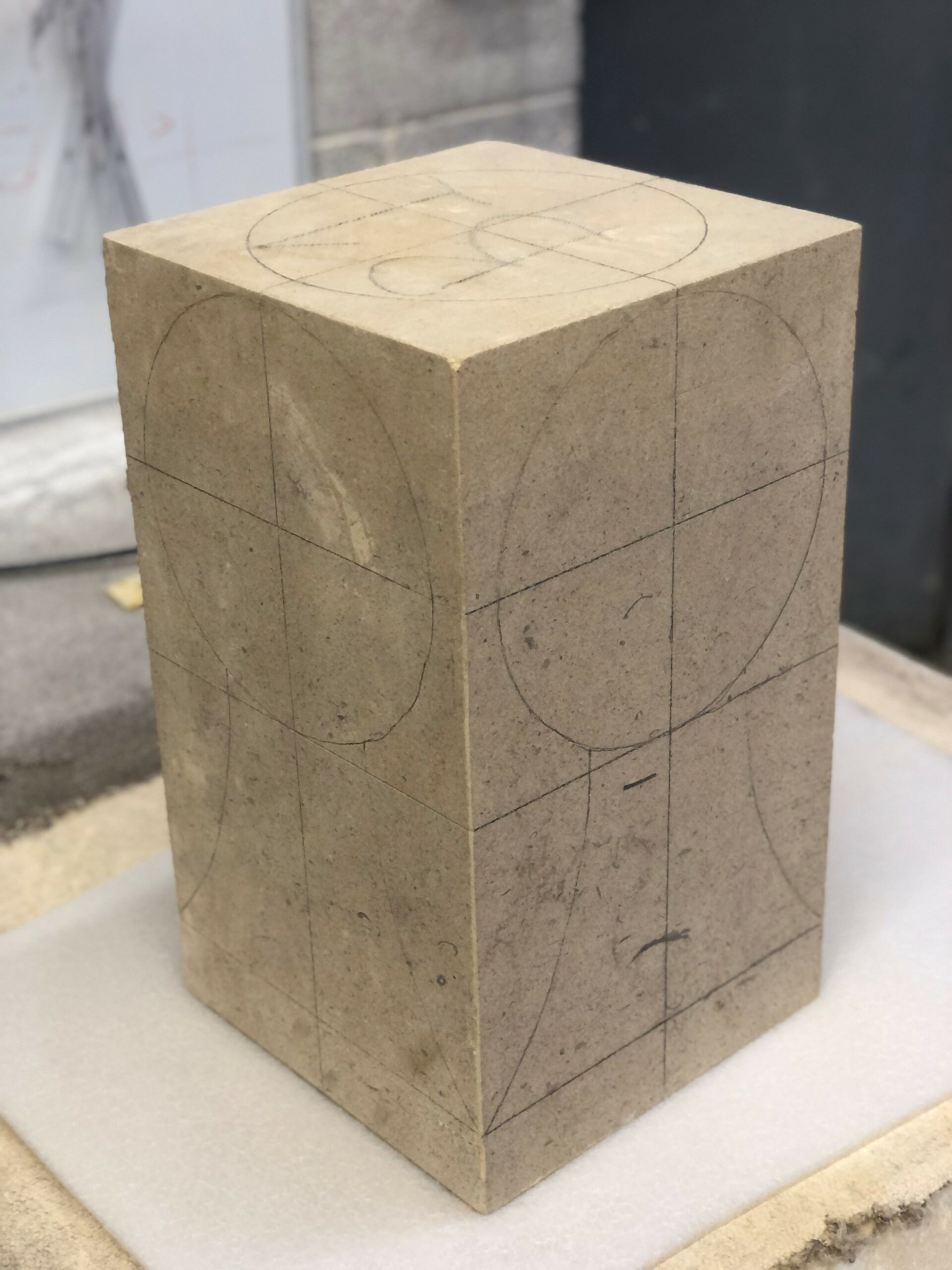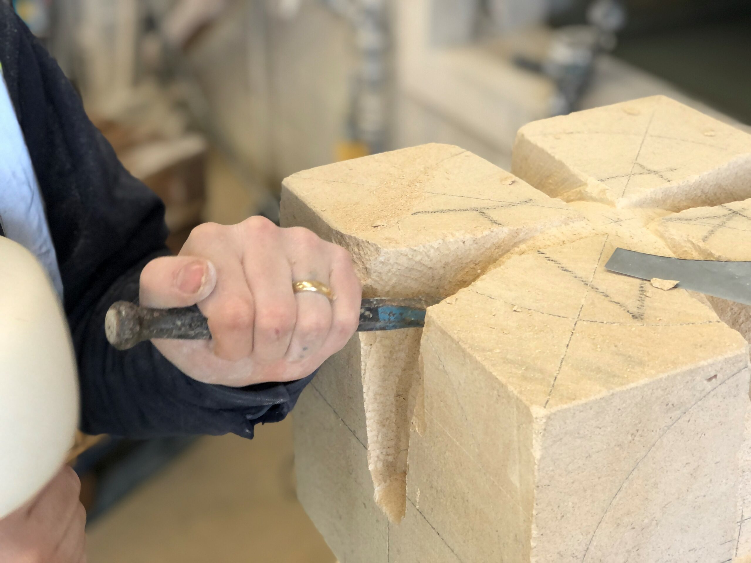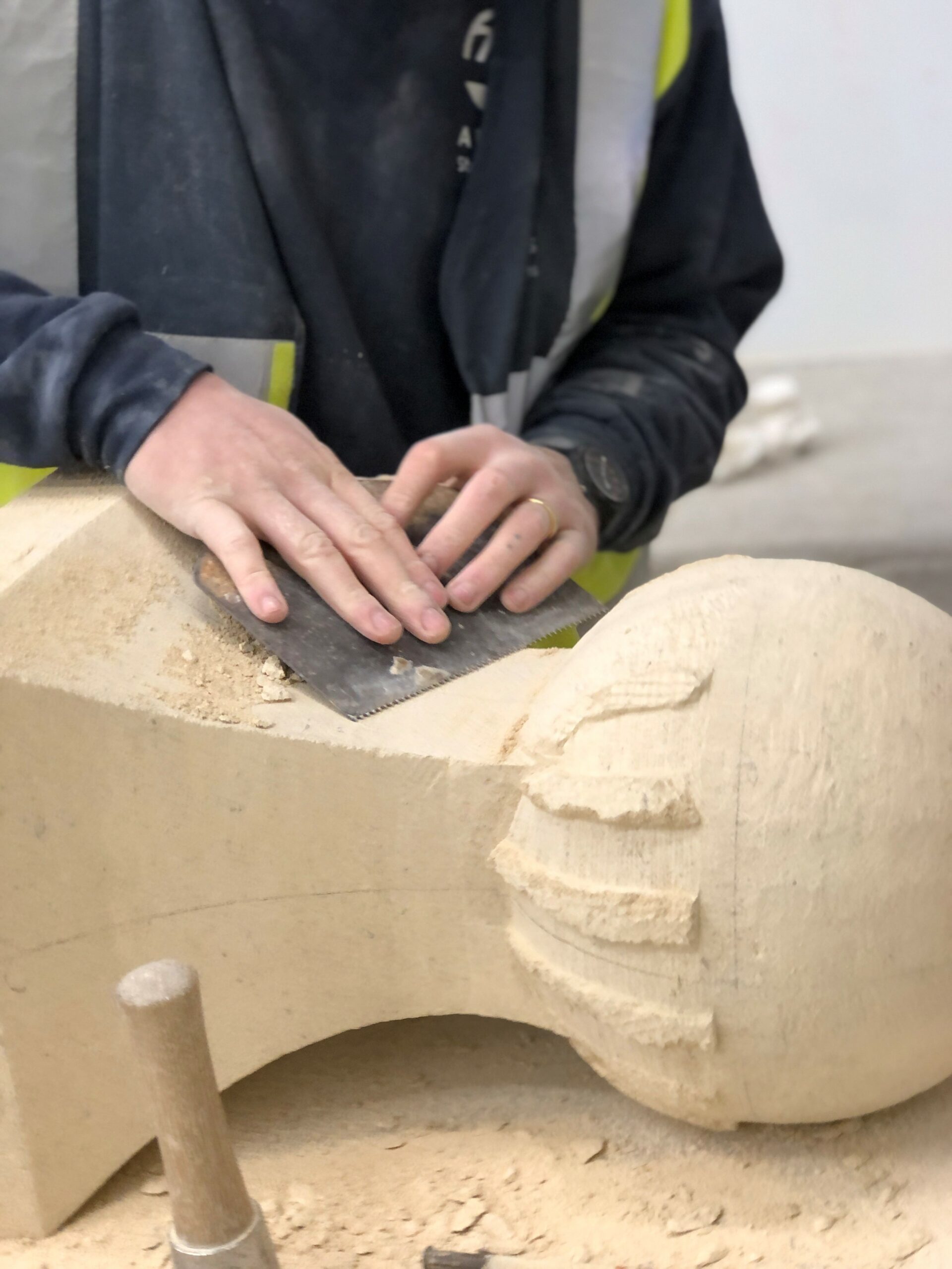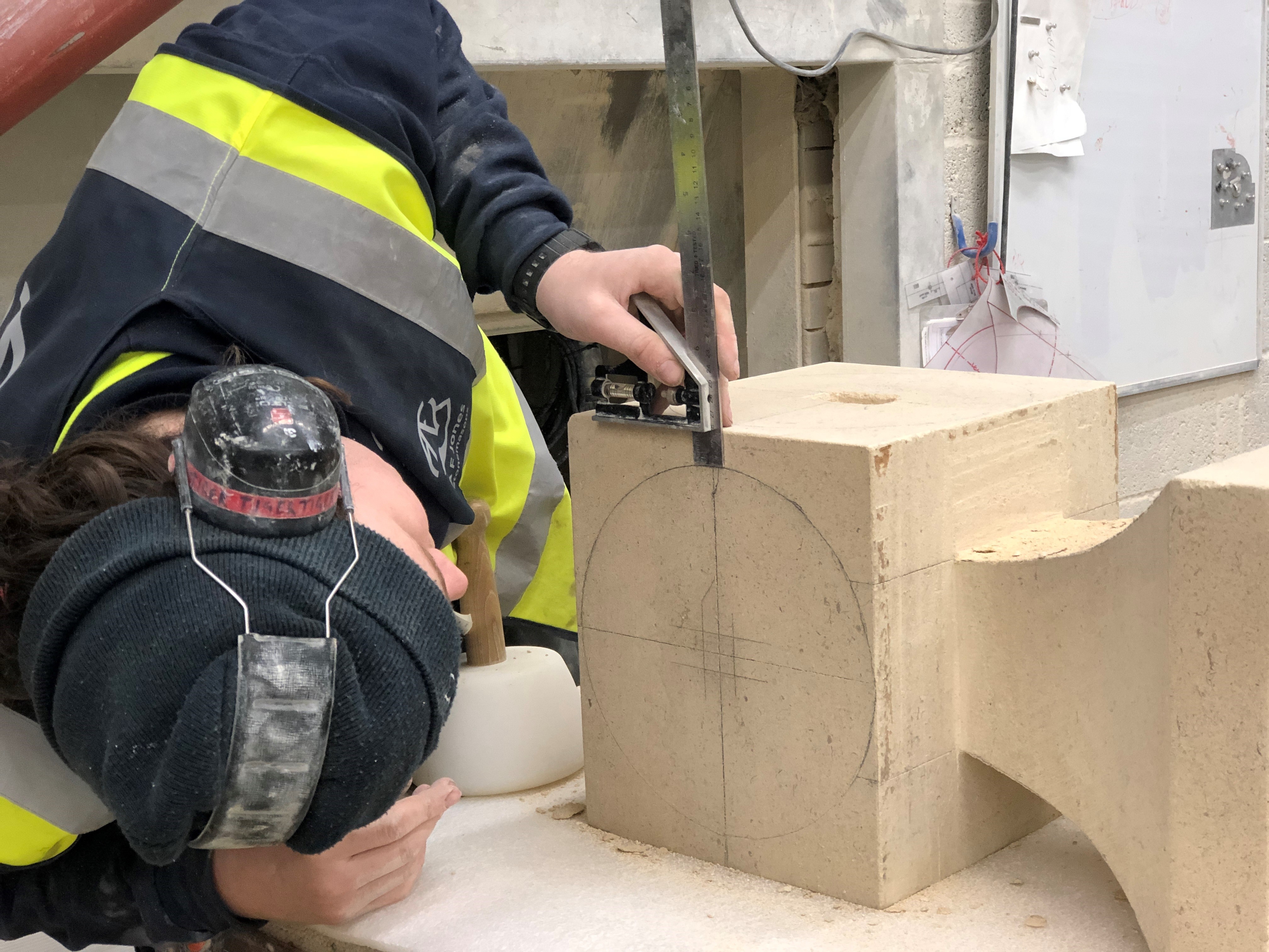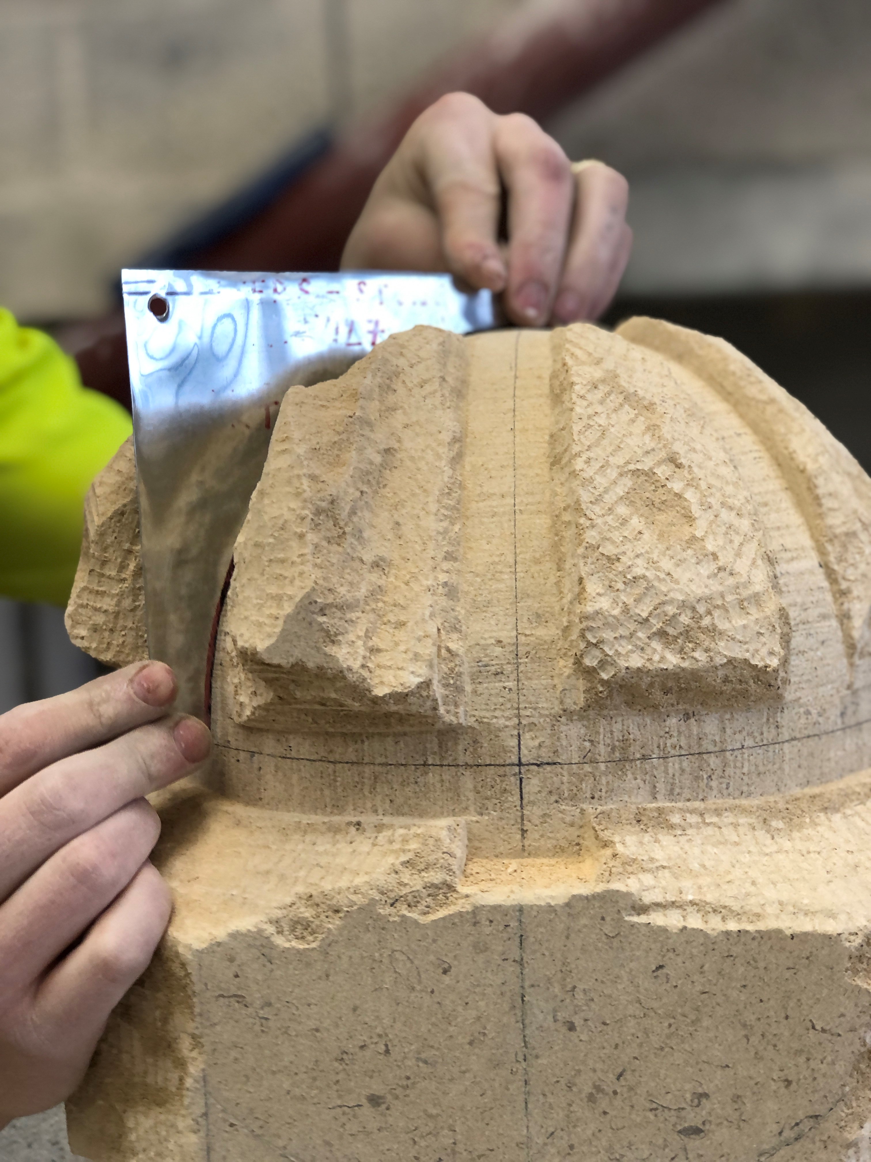 The second is with a reverse template. One of our banker mason apprentices, Tiger, is pictured here using a zinc reverse to cut curved drafts into the blank, gradually forming the spherical ball of the finial: the latest in a long line of apprentices at AF Jones to successfully complete this challenging job.