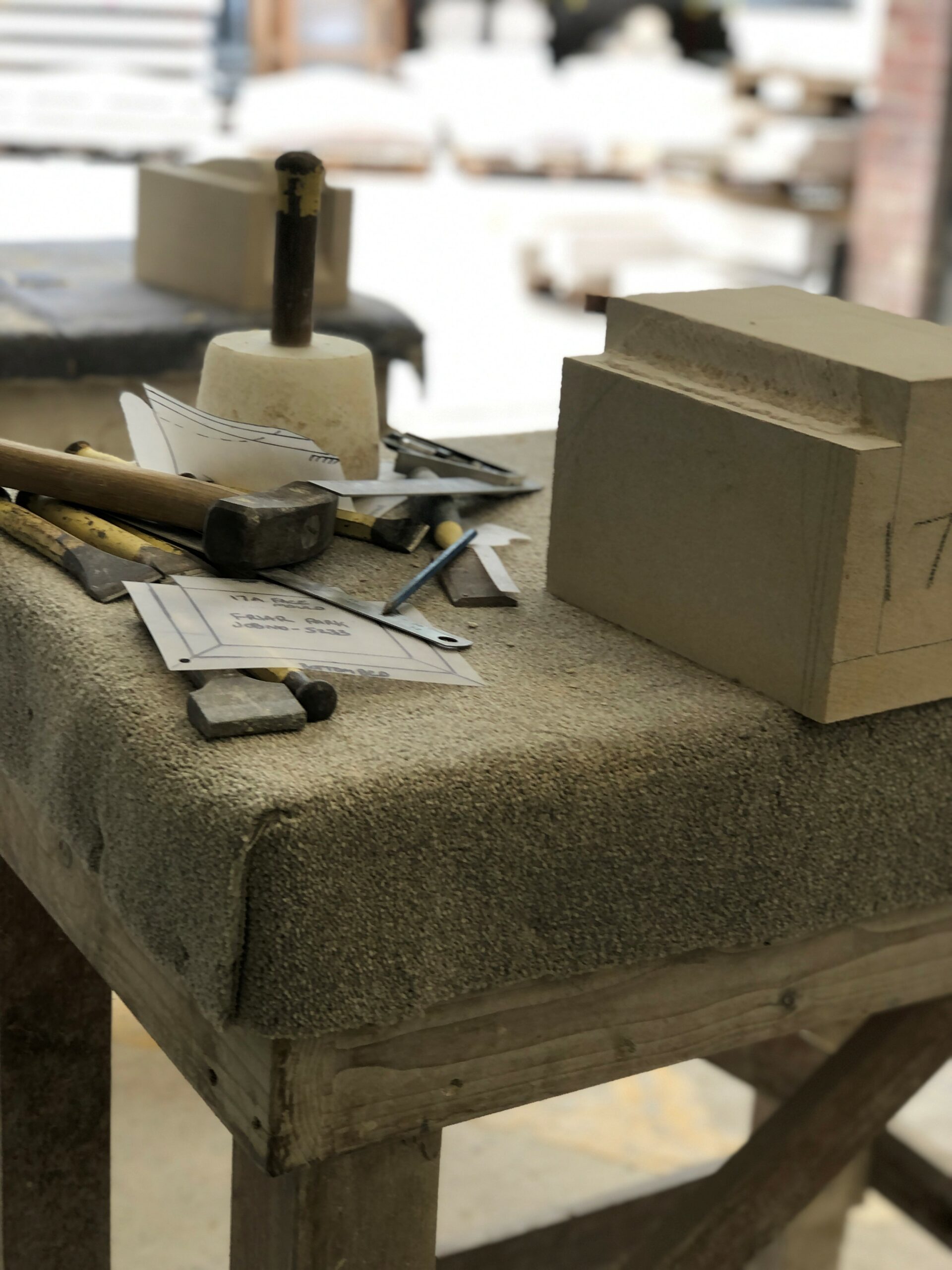 The first is a banker. It’s been the basic work surface for masons for hundreds of years and gives its name to a specific type of stonemason – The Banker Mason, who carves detail at this work surface.